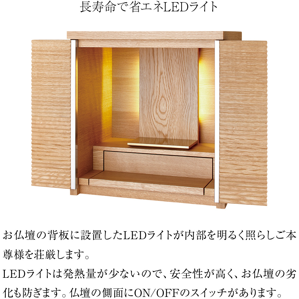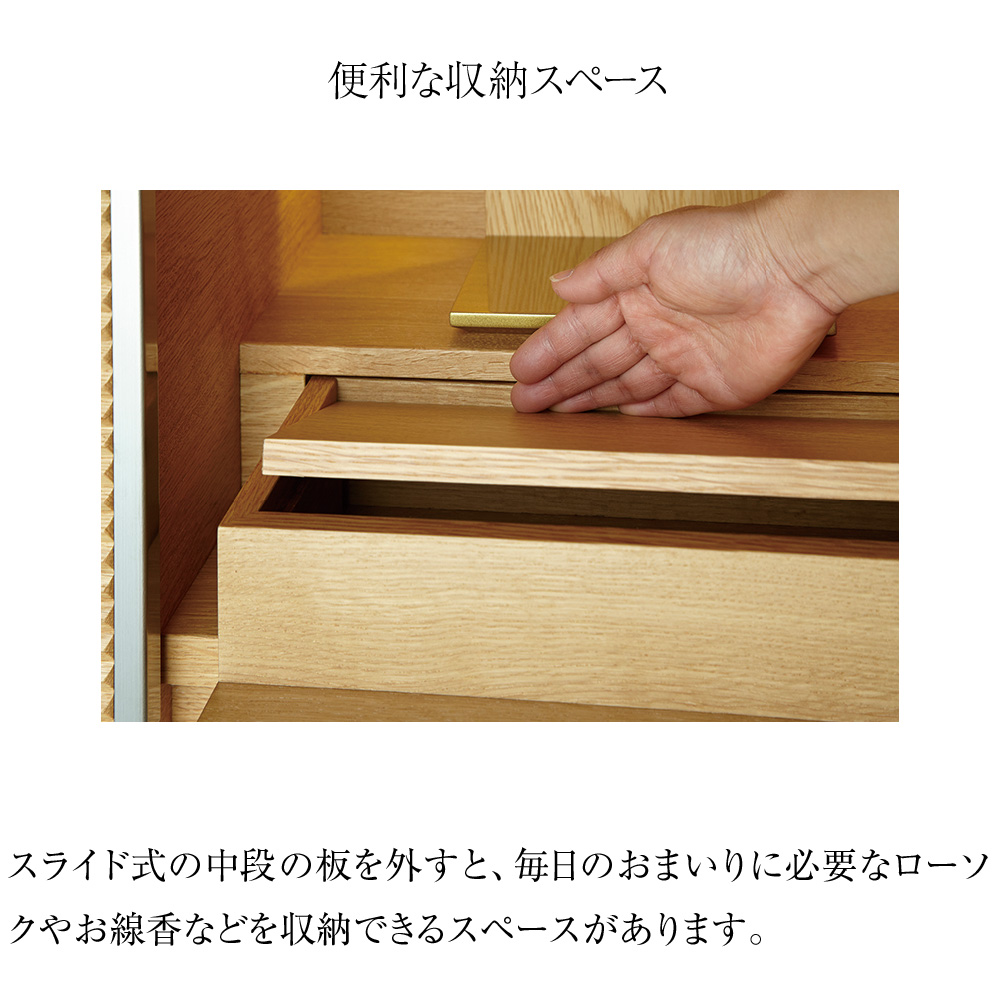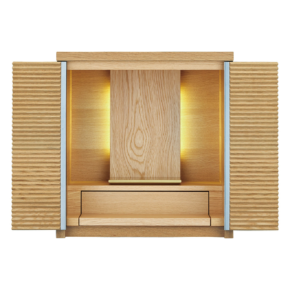 現代のライフスタイル、暮らしのスペースにマッチしたコンパクトサイズのお仏壇です。チェストや整理タンスの上にもお飾りいただけるので、ご安置する場所を選びません。扉はナラ材の無垢で仕上げています。確かな品質を誇る入念な仕上げの国産のお仏壇です。すべての宗派でお使いいただけます。