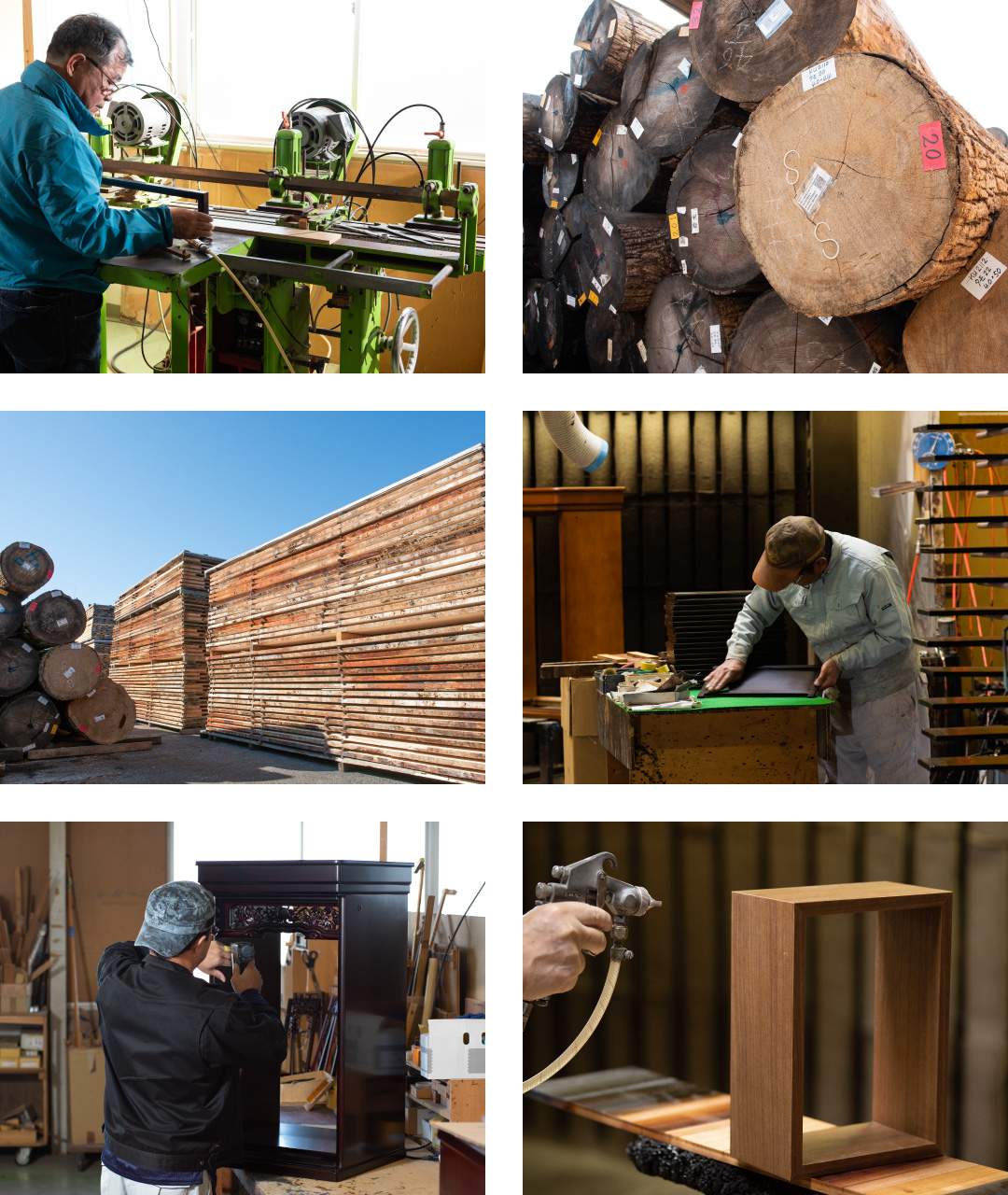 丸太を北米から取り寄せて、国内工房で長い年月をかけて十分に乾燥させ、製材された木材は、熟練の木工職人によって細かい部分まで丁寧に研磨され、自然のままの原木からようやくお仏壇の材料へと生まれ変わります。