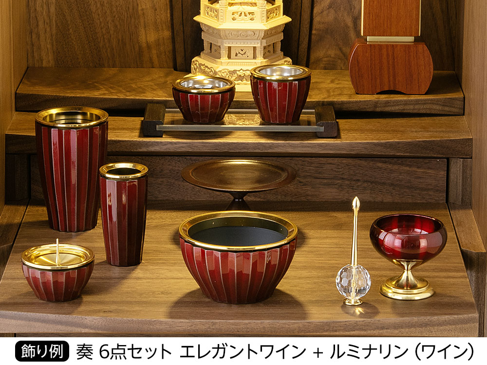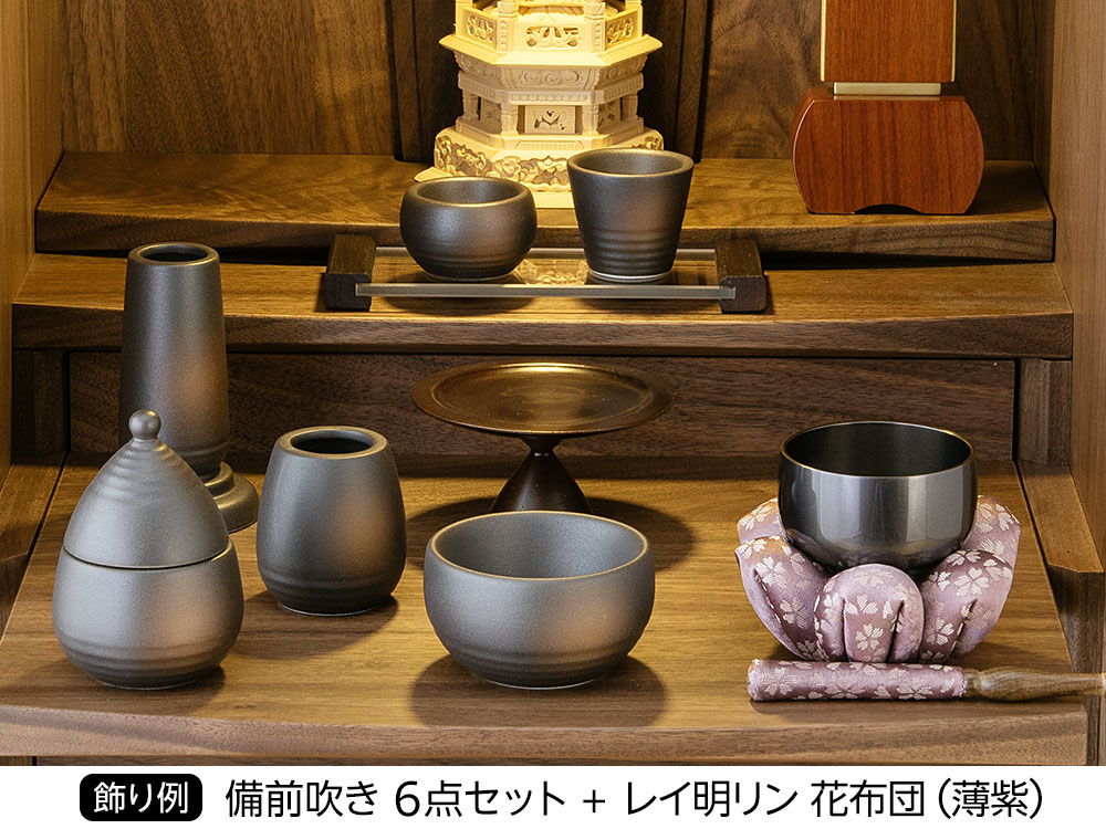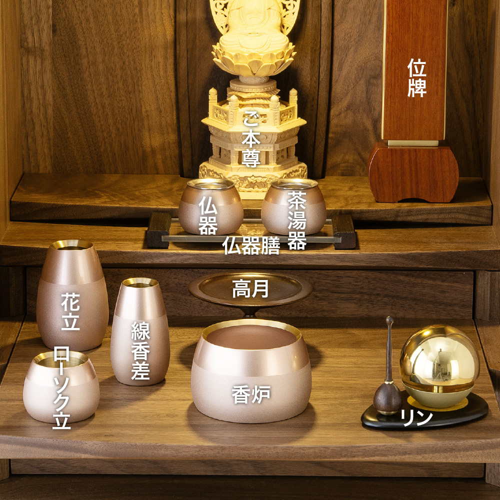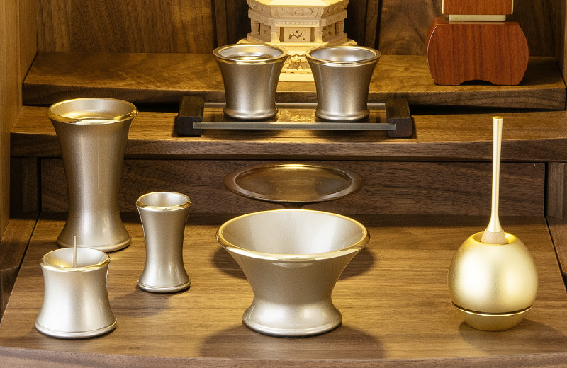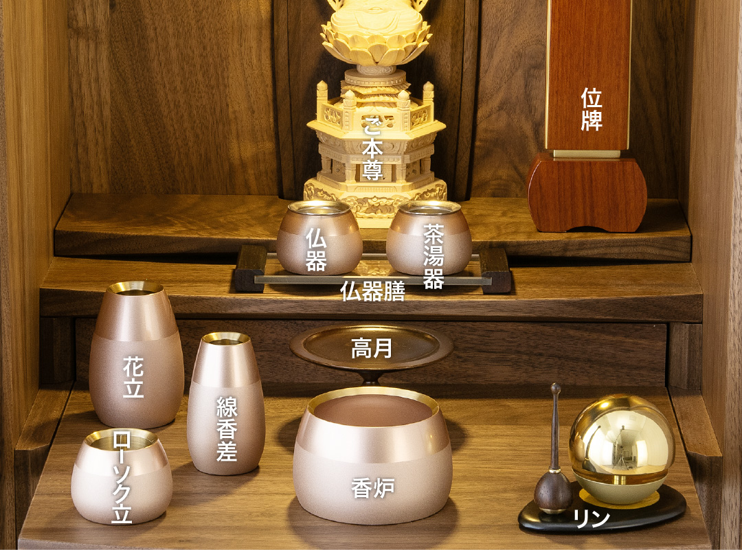 お仏壇をお使いいただくのに必要な仏具や小物などをセットにしてお届けいたします。