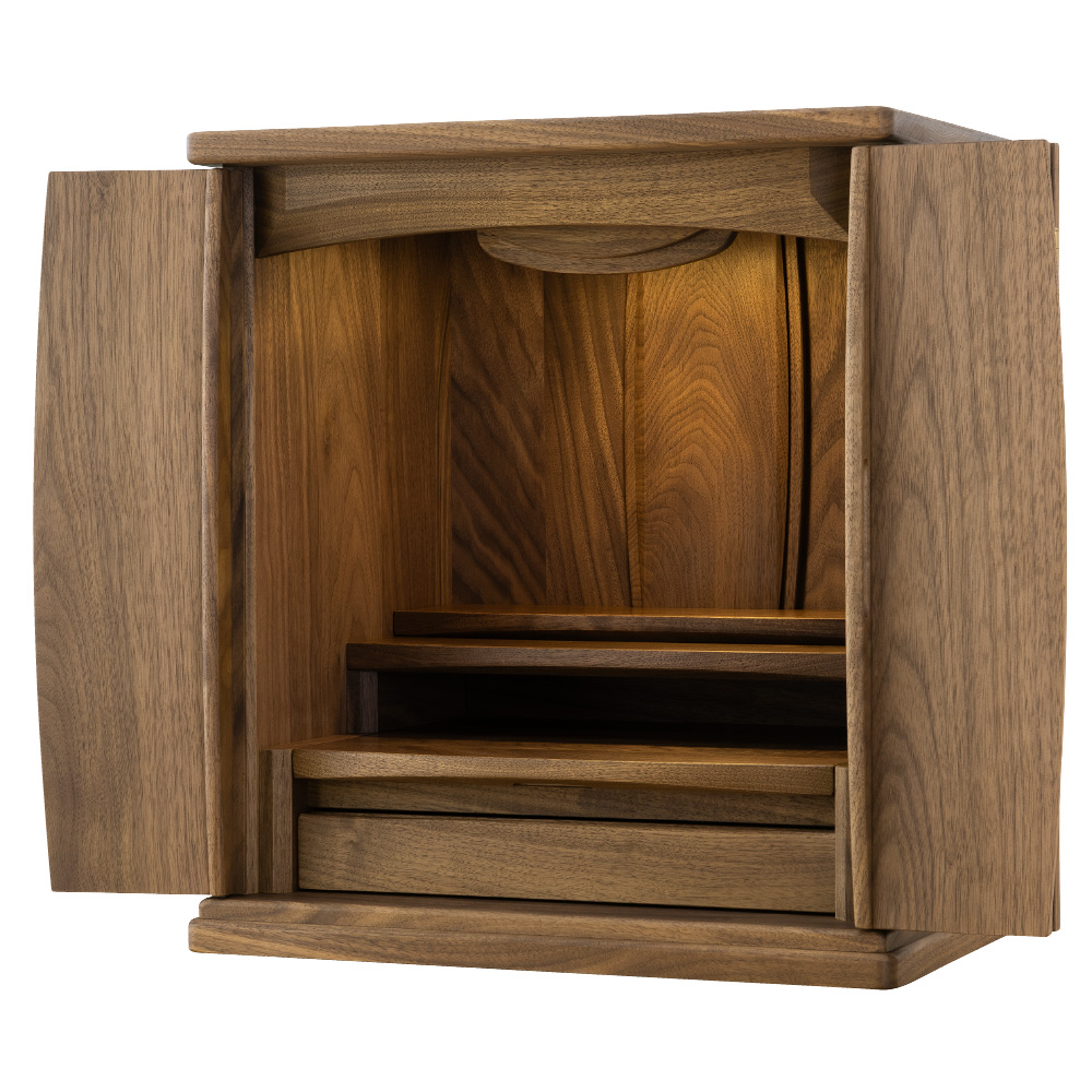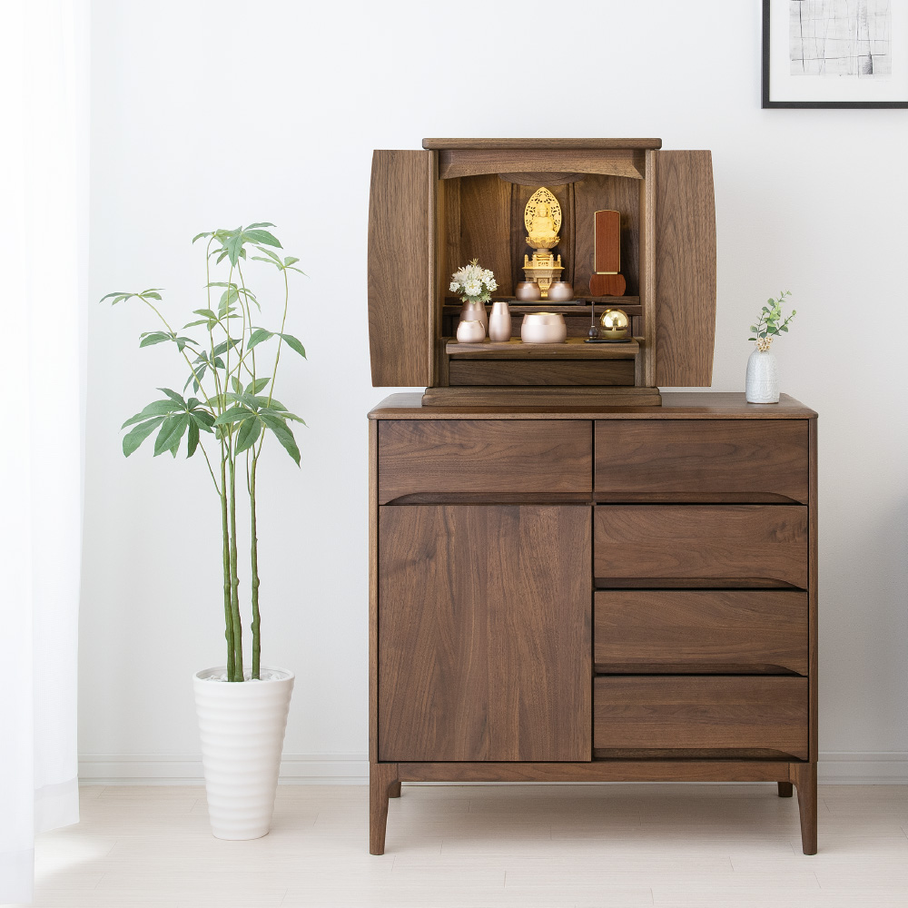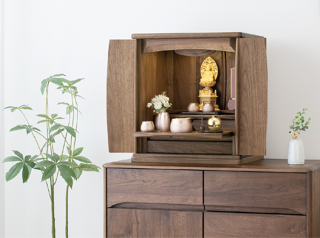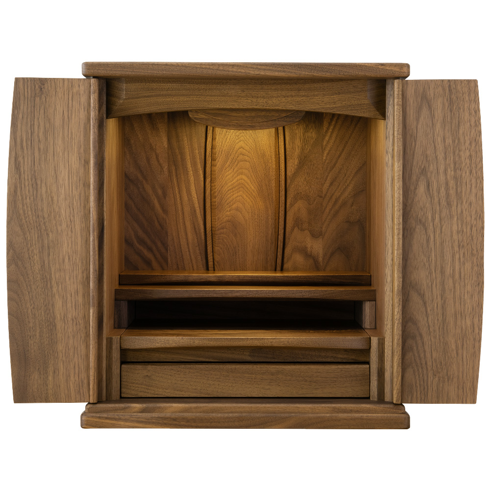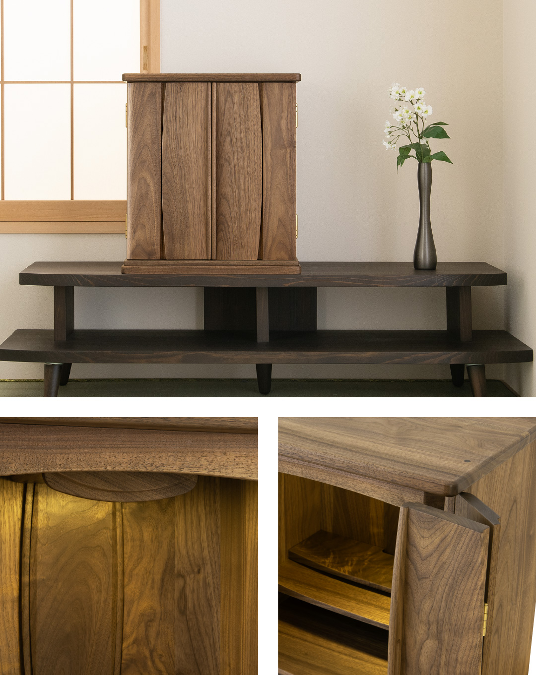 強靭で耐久性に優れたウォールナットを贅沢に使用し、高級家具の産地・静岡県で生産したお仏壇「かたりね」。