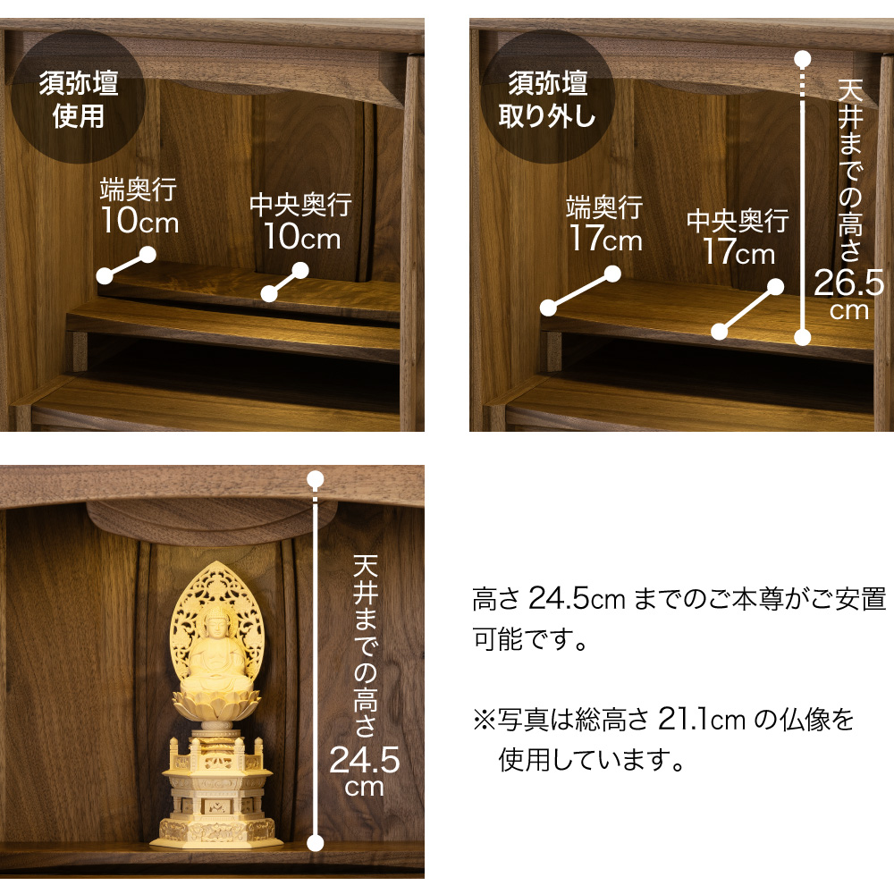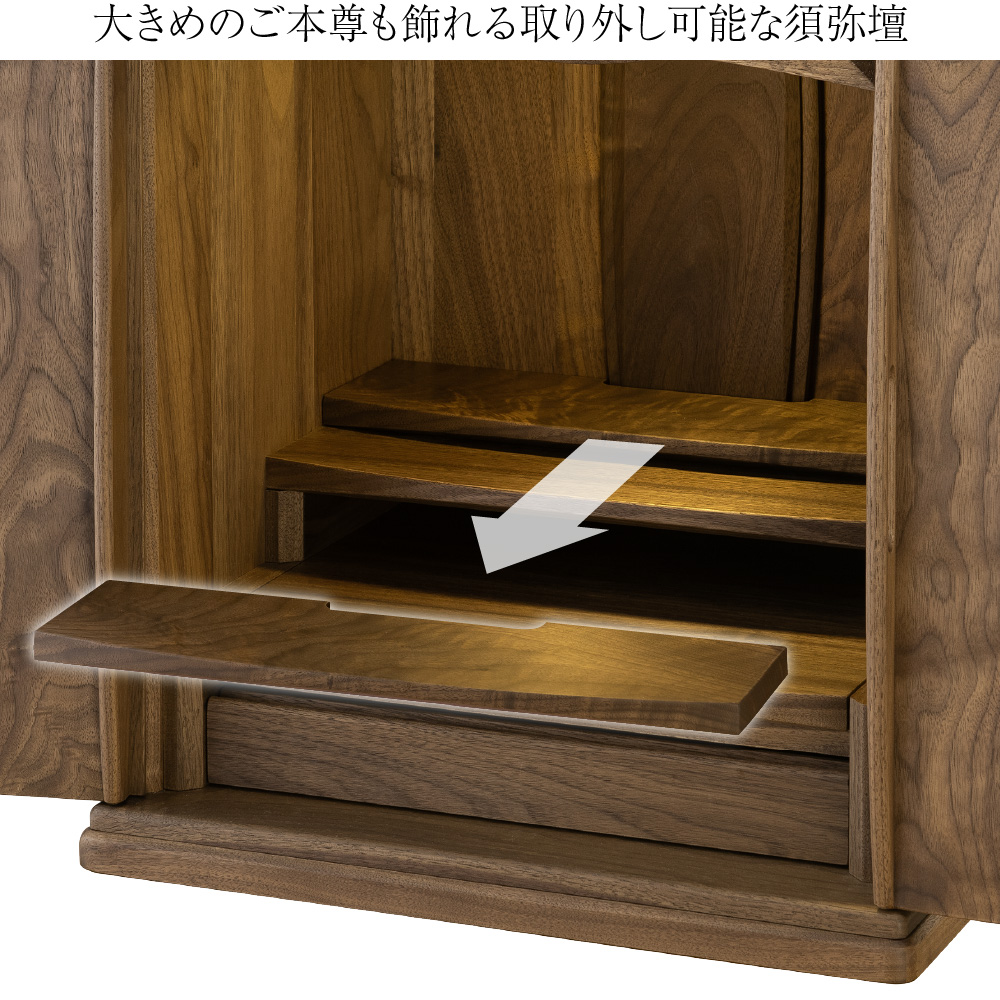 内部の須弥壇は簡単に取り外すことができます。取り外して大きめなご本尊様やお位牌をご安置いただくこともできます。