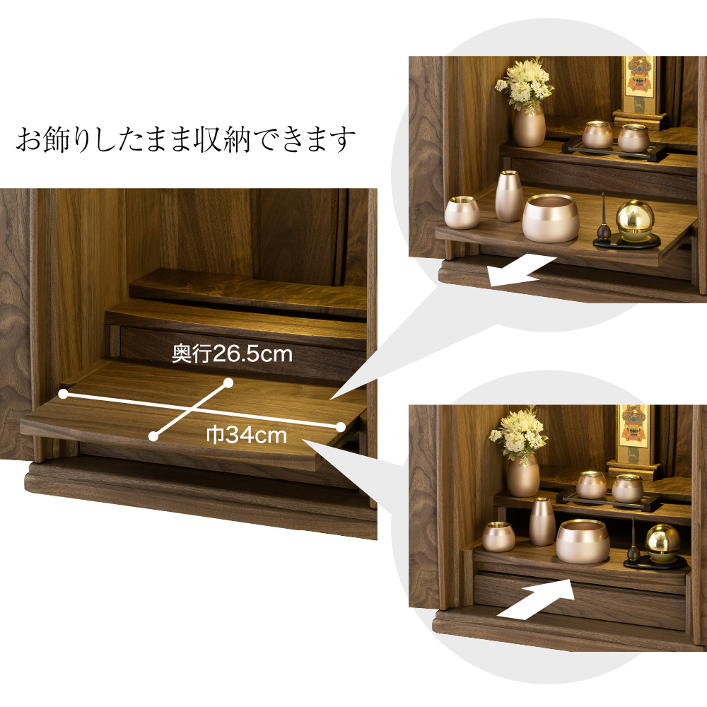 仏具を広々設置できるスライド式の棚板が付いています。火を使うローソクや線香などの仏具は安全上、手前に出してお使いください。使わないときにも、仏具をのせたまま棚板を収納できるので便利です。