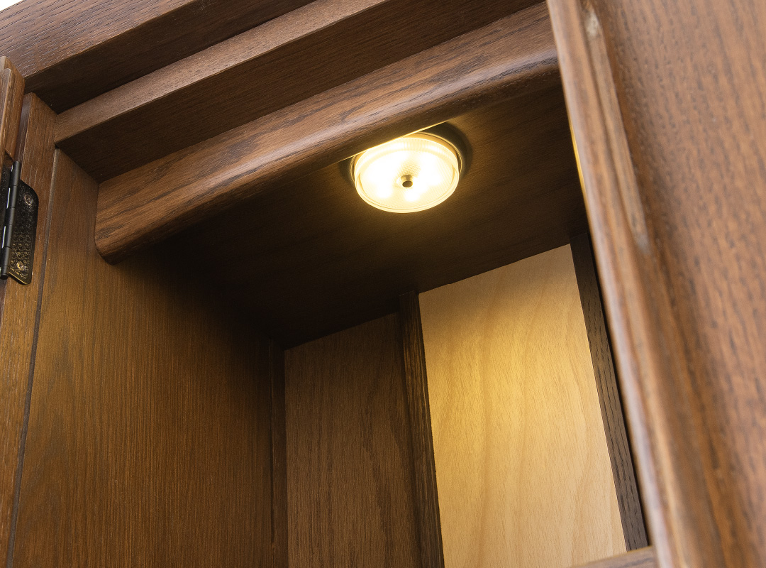 LEDライトは発熱量が少ないので、安全性が高く、お仏壇の劣化も防ぎます。ライトの中心にON/OFFのスイッチがあります。