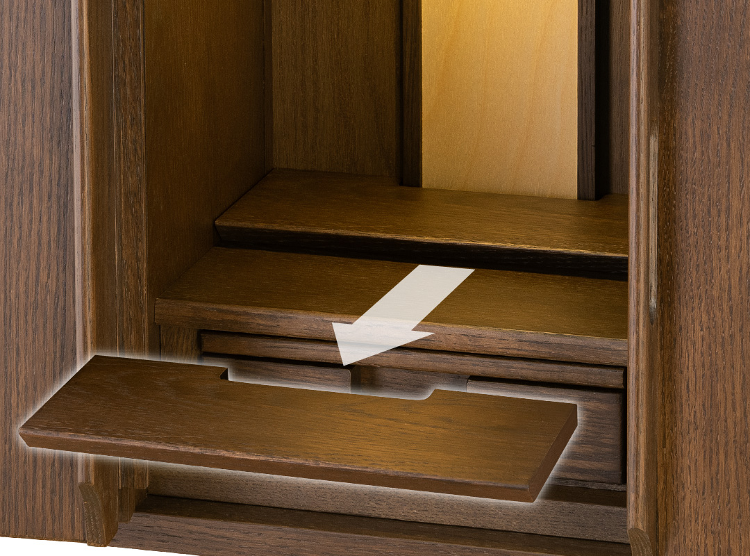 仏具を広々設置できるスライド式の棚板が付いています。火を使うローソクや線香などの仏具は安全上、手前に出してお使いください。