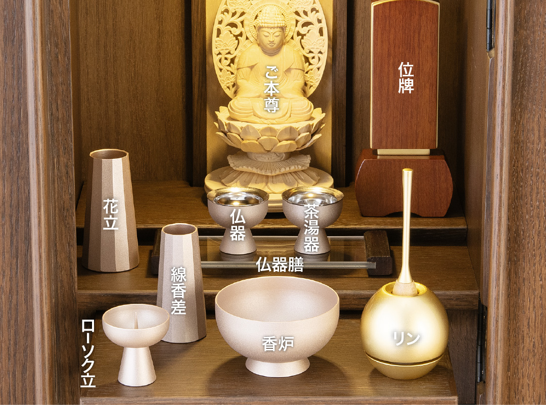 お仏壇をお使いいただくのに必要な仏具や小物などをセットにしてお届けいたします。