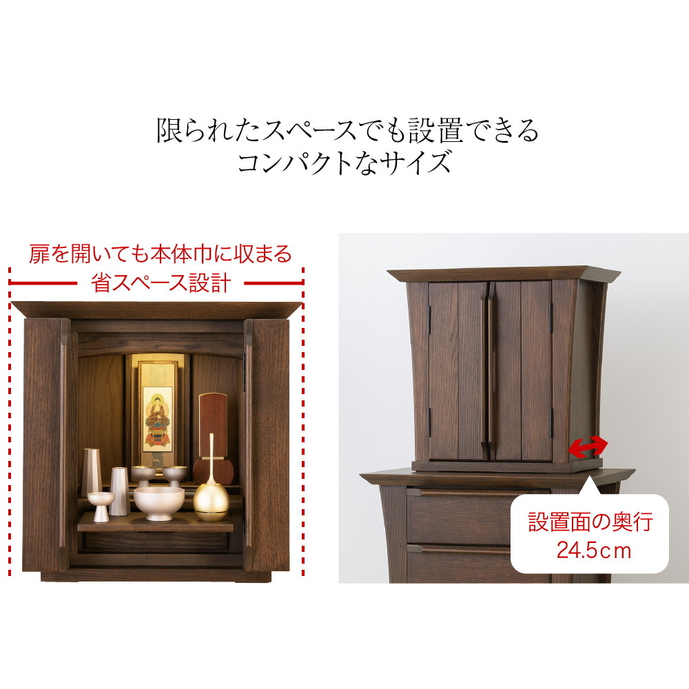 扉を開いても仏壇本体の巾に収まる設計で、限られたスペースにもご安置いただけます。