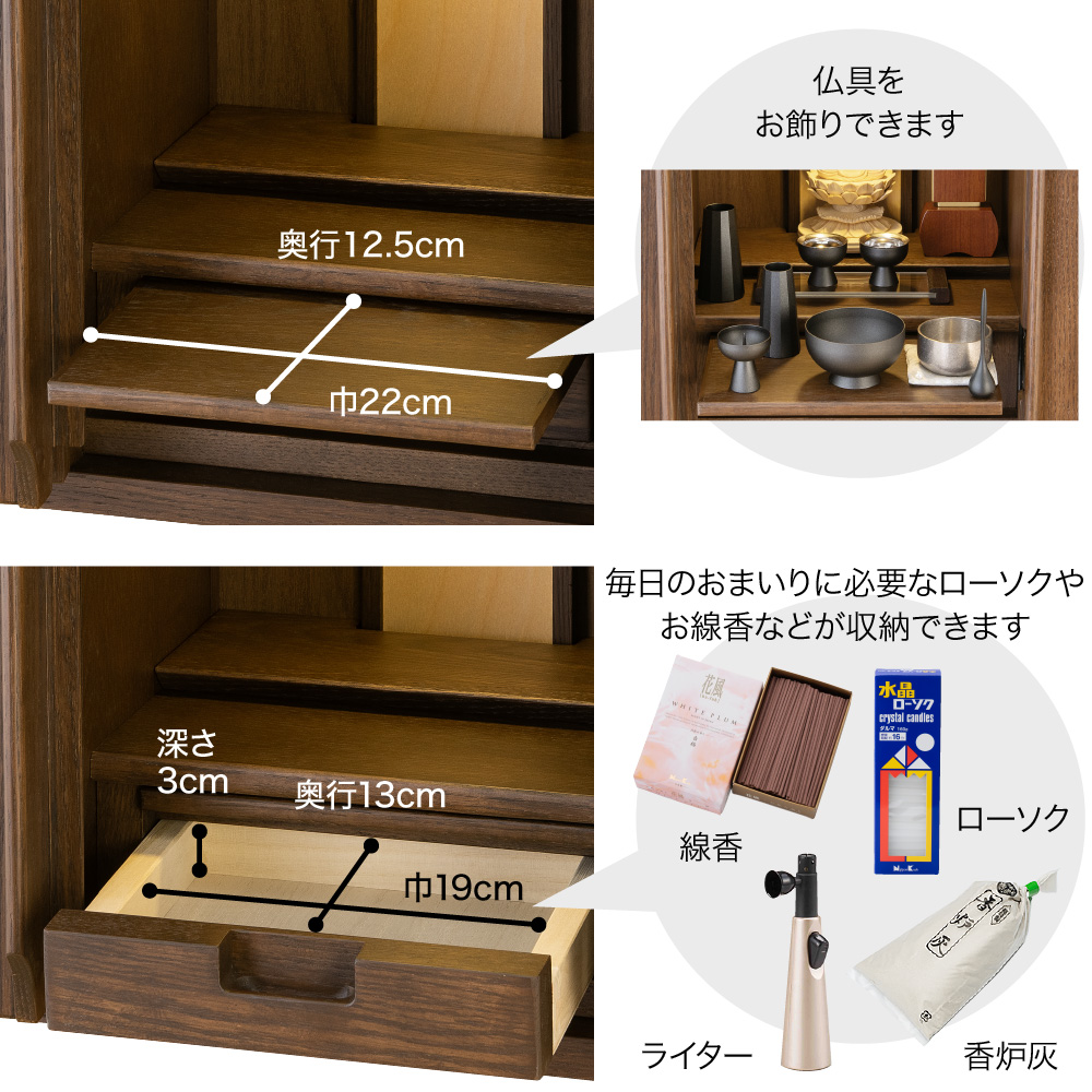 毎日のおまいりに必要なローソクやお線香などの細々したものを収納できる引き出しが付いています。普段使わない仏事用品の保管にもぴったりです。