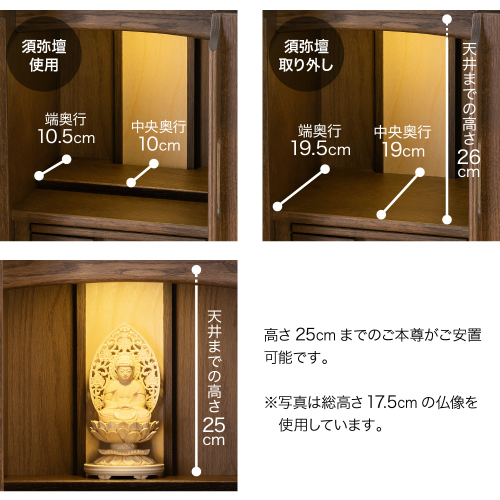 内部の須弥壇は簡単に取り外すことができます。取り外して大きめなご本尊様やお位牌をご安置いただくこともできます。