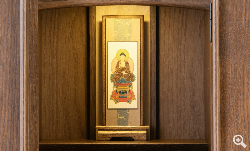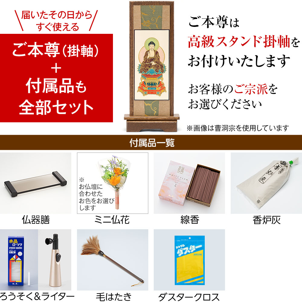 ご本尊様は、仏壇の中央にそのままご安置できるスタンド型の掛軸をお付けいたします。