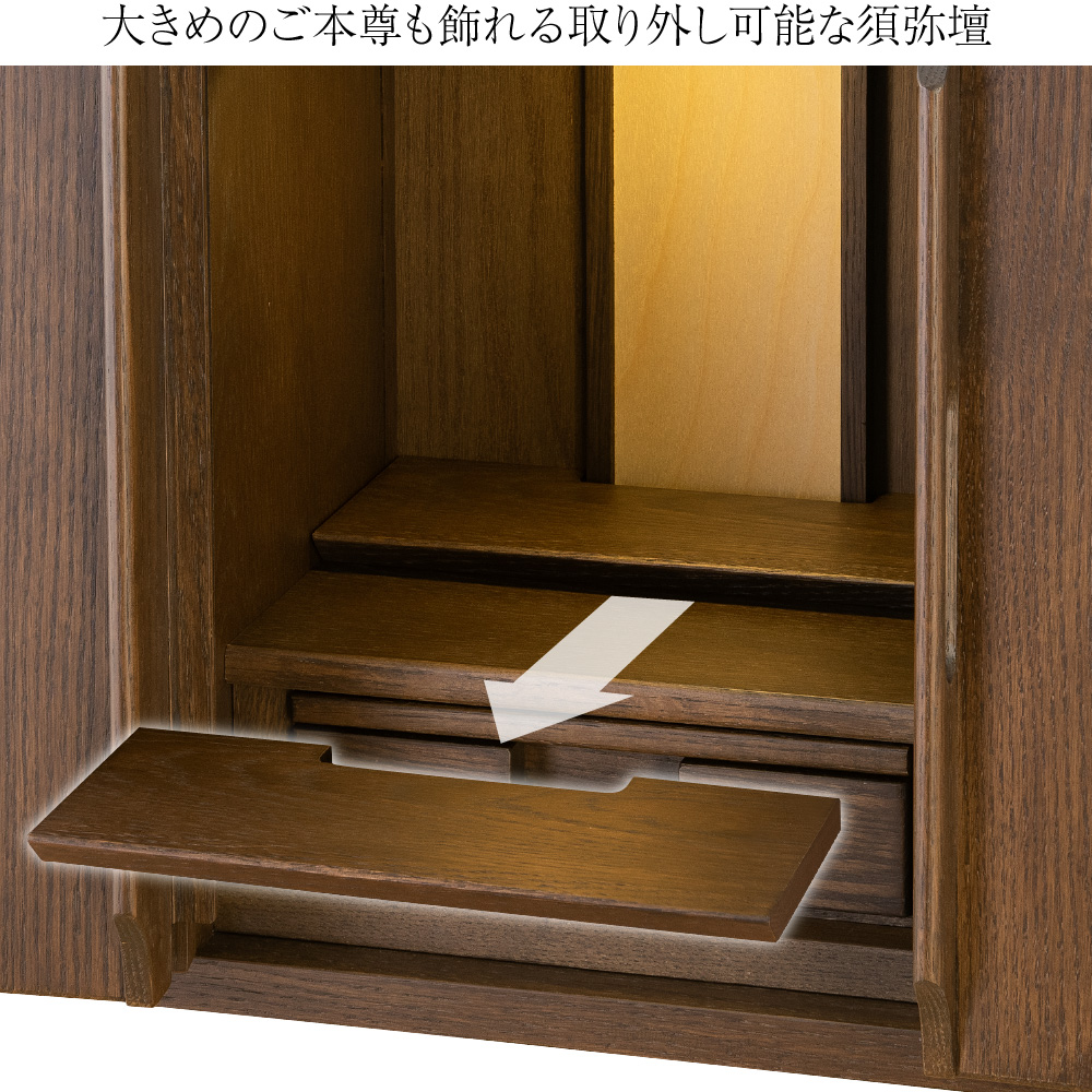 内部の須弥壇は簡単に取り外すことができます。取り外して大きめなご本尊様やお位牌をご安置いただくこともできます。