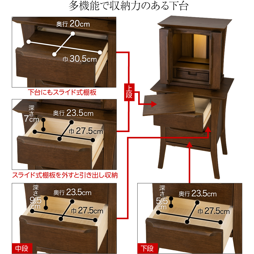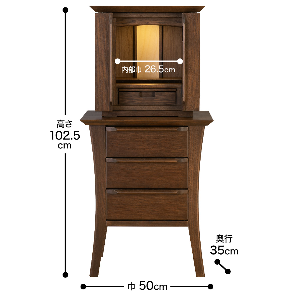 | 仕様 | LEDダウンライト / 須弥壇取り外し式 / スライド式棚板 / 引き出し(上台×1、下台×3) |
