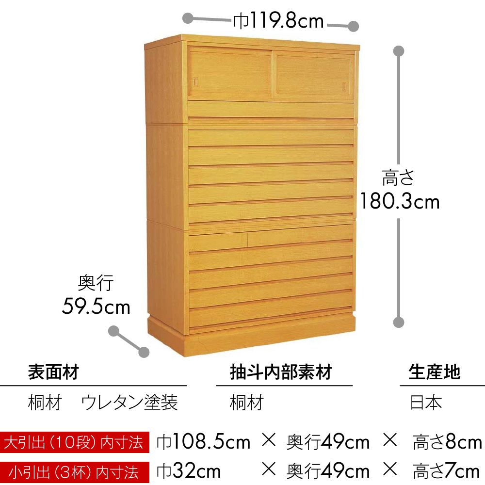 大引出内寸法巾108.5cm×奥行49cm×高さ8cm(10段)