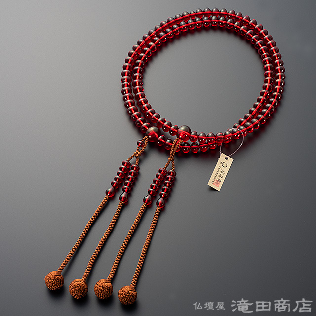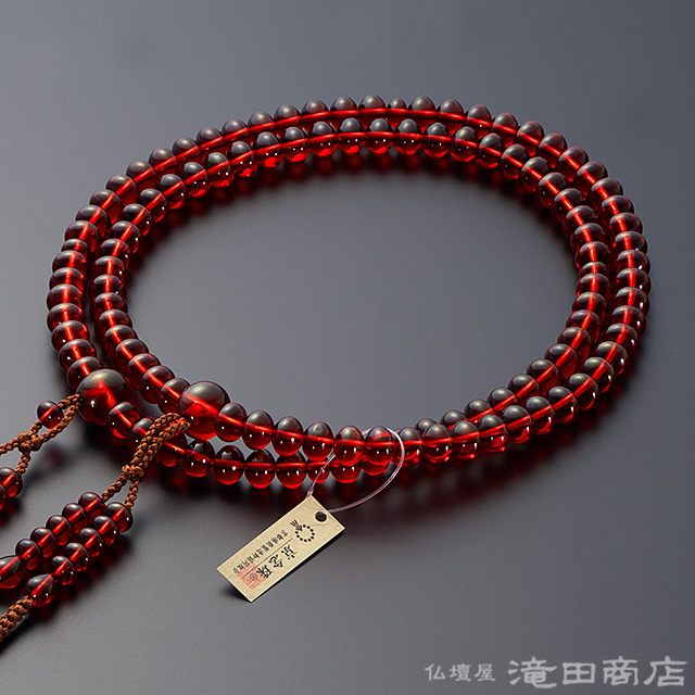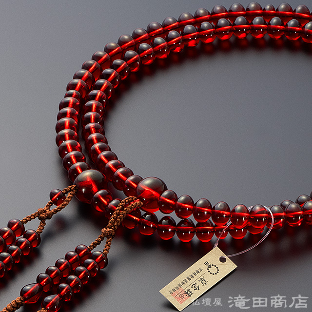まるで深紅のルビーのような、引き込まれる美しさを持つレッド琥珀(レッドアンバー)を使用した男性用の真言宗用本式数珠です。